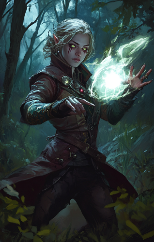 a small short hobbit female punk-style criminal bandit in an art deco banshee spirit mage armor summoning a spirit from her hands with a night forest in the background in the style of pathfinder and The witcher character art, HD --ar 12:19