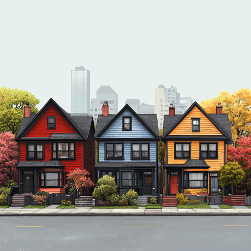 real estate row of houses and each house has the same design. They are spaced apart in long row. Each house has one color in common and only one other color that is different than the rest. In the background of the housing row is a faint skyline in gray colors. The design should be simplistic with minimal detail. no landscaping or greenery --s 750 --q 2