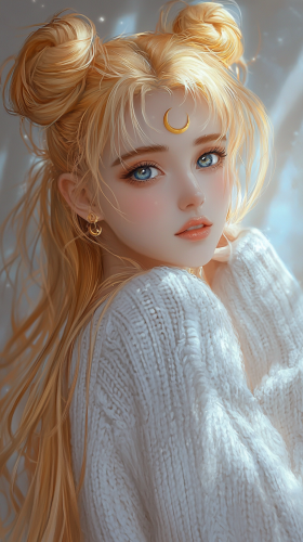 Rei Hino characters Sailor moon a beautiful girl , wearing a white sweater,yellow hair and blue eyes,long eyelashes,golden moon decorate her face,background is the bedroom,soft and soft colors are used with surreal portrait styles and fantasy illustrations,the ethereal background provides alovely catoon design,which softly lights up the dreamlike,digital art technology shows detailed strokes in high resolution in the style of afantasy illustrator. --v 6.1 --ar 9:16