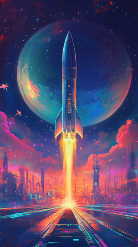 Cyberpunk city skyline at night. Neon illuminated skyscrapers. Multicolored energy swirls in the sky. Bright Saturn in the distance. Flying vehicles. Detailed architectural elements. Vibrant color palette of blues, oranges, and purples. Stars in the background. Digital art style. High contrast. Dynamic elements. a beautiful, big fantasy rocket shaped like a full body of a beautiful young woman. The rocket stands on the launchpad and is ready to fly. surrounded by dynamic elements like swirling digital effects, and futuristic patterns to emphasize the cryptocurrency theme. Incorporate a mix of bold and neon colors to give the design a modern, tech-savvy feel, --ar 9:16