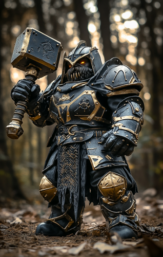 a dwarven evil looking criminal enforcer barbarian in an art deco designed black and bronze gold accented armor weilding a heavy serated mace with a night forest in the background --ar 12:19