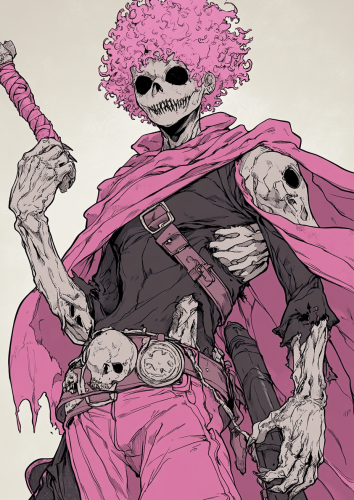 dorohedoro, The grim reaper, death incarnated, lich, kawaiipunk, kitty, pink, curly hair, strong jawline, hour glass, slim waist, Symmetry, proportion, fitness, curves, exaggerated features, overemphasized chest, over the top hero, height, clear skin, and balanced features, smiling sinister proud happy expression by fujifilm superia --ar 500:707 --v 6.1