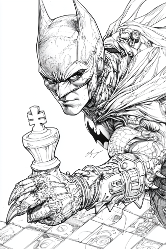 steampunk batman boy, fighting pose, merging into the white knight piece on a chessboard, his lower body is a chess piece, close up, cyberpunk, line art, white background, colouring page, detailed face, detailed eyes --ar 2:3 --q 2