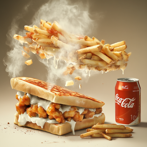 A very realistic side image of a thin, toasted saj galette. It contains pieces of chicken and fried potatoes with white sauce, so that part of the chicken pieces, fried potatoes and white sauce fly over the sandwich in the air, in an artistic advertising design, with smoke rising from it, and the white sauce appears in an advertising way. Next to this sandwich is a box of french fries with ketchup sauce in an advertisement, and next to them is a can of Coca-Cola that appears in an advertisement.