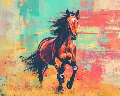 a powerful wild horse gallops down a grassy hill, the wind is blowing in the mane , view of the horizon, dramatic nature, emotional art, bright colors, negative colors, shapes are fluid and undefined, high definition digital art, negative color, a mix of pastel colors and neon, a poetic and creative perspective, inspired by Man Ray's visionary photography, large-screen camera, photo art that is also inspired by digital art, cold color scale with hints of flickering neon, --ar 5:4 --p 6s1y8tz