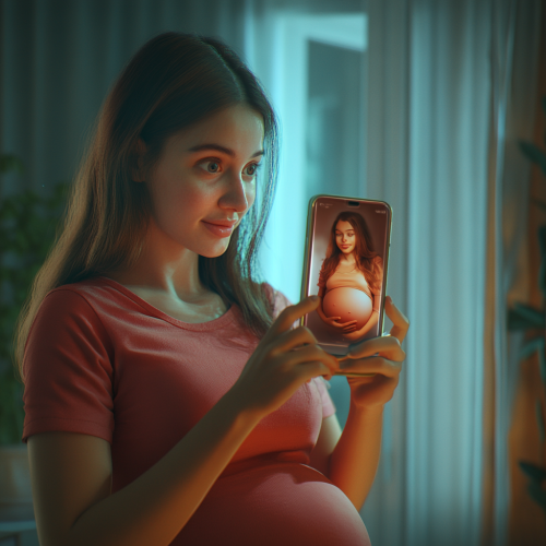 Create an image where a young woman is holding a smartphone, looking at the screen with a mix of curiosity and surprise. On the phone's screen, there is a realistic depiction of herself with a visible baby bump, as if she is using a pregnancy filter on Instagram. The filter subtly alters her appearance to show her as pregnant, while keeping the background and the phone’s interface intact. The setting is modern and well-lit, emphasizing the contrast between her real self and the digital transformation displayed on the phone.
