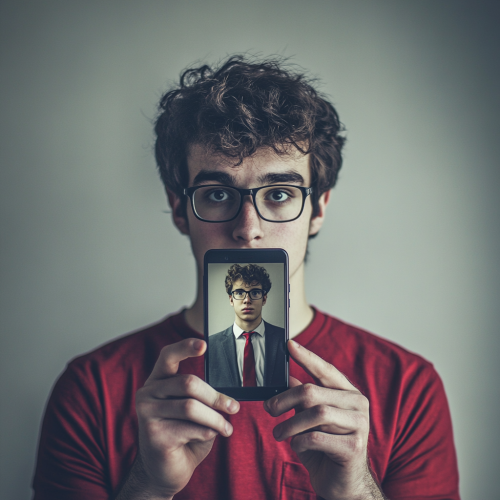 Create a photograph of a smile young man with t-shirt holding a smartphone, looking at its screen with a blend of curiosity and surprise, funny. On the phone's display, he sees a version of himself dressed as a secretary, complete with glasses and formal office attire, as if it's an Instagram filter. The filter should realistically transform his current appearance into this professional look. The setting should be contemporary and well-lit, focusing on both the young man and the phone’s screen to emphasize the contrast between his present self and the filtered, office-ready version
