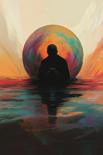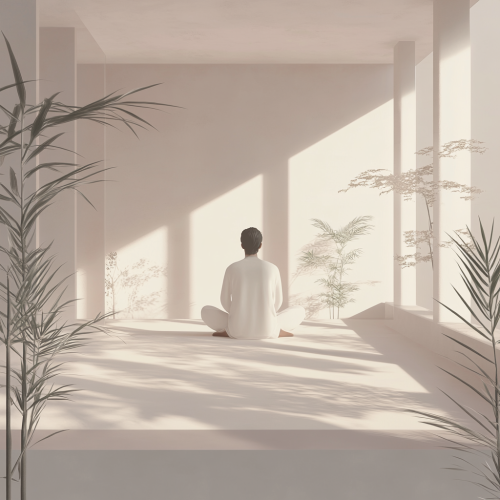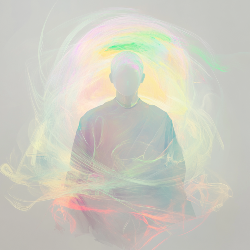 Generate a digital art for A digital art scene depicting a serene individual practicing mindfulness in a tranquil environment, surrounded by soft, calming colors like light grey and pastel shades, symbolizing peace and focus. --ar 1:1
