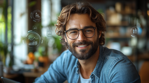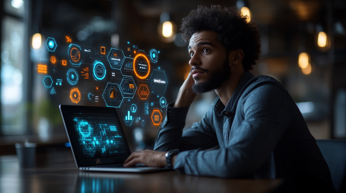 A busy business owner sitting at a modern desk, looking curious and intrigued, with multiple digital tools and icons related to optimization (like SEO, automation, and analytics dashboards) floating neatly around the workspace. The screen of the laptop shows a comparison of unoptimized versus optimized performance, with the optimized side showing significantly better results. The business owner is leaning forward, as if discovering the benefits of these tools. Natural lighting from large windows brightens the room, adding a calm and professional atmosphere. Hyper-realistic style, detailed textures, 4K resolution, clean and engaging atmosphere. --ar 16:9 --s 750