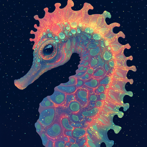 outline of a seahorse, hypothetical surealisim beautiful, colorful, cosmic, futuristic, detailed,mark brooks, frank frazetta, david mann, kilian eng, jeff koons, digital painting, surrealism, detailed fantasy by john stephens, galen rowell, david muench, james mccarthy, hirō isono, realistic surrealism, elements by nasa, magical, gloss, hyperrealism, dystopian, iridescent, firey, andy warhol, jeff koons, Roy Liechtenstein --sref 626965625 2806382470 3287450730 --style raw --s 750 --p ef1cw5c