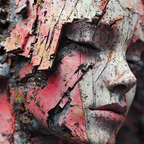close up of a contemporary figurative sculpture of a punk woman mixed with abstraction and glitched textures , corrosion figures, 3d render, 8k, octane render