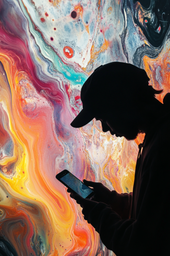 autostereographic style, it shows one dark silhouette with a phone, getting totally distracted from it, the phone consumes the silhouette and pulls out the last color of the silhouette, the background looks like if you mixed up all different oil colors in water, melancholic art and a whole lot of sureality, --ar 2:3 --v 6.1