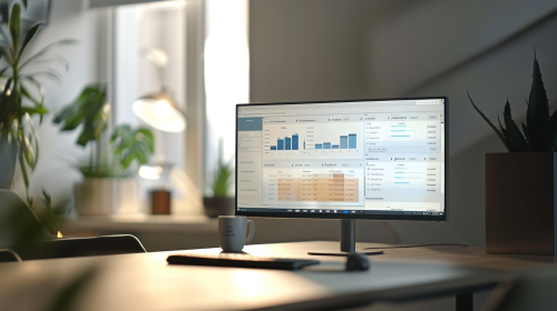 A sophisticated office setting with a desktop screen showing a digital marketing dashboard, background blurred with minimalistic decor, natural daylight filtering through, smooth gradients and soft shadows, calm and inviting tones --ar 16:9 --v 6.0