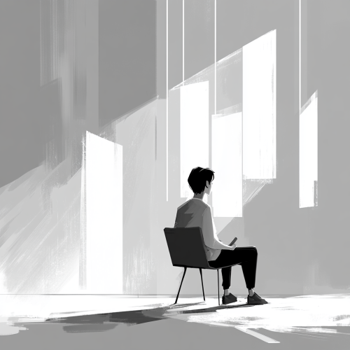 Generate a digital art for A digital art scene showing a person confidently answering questions in an interview setting. The background is structured with clear, concise, and relevant elements symbolizing the STAR method. Use shades of light gray for the background and incorporate elements in white and black to emphasize clarity and structure. --ar 1:1