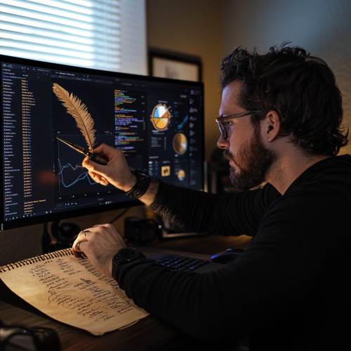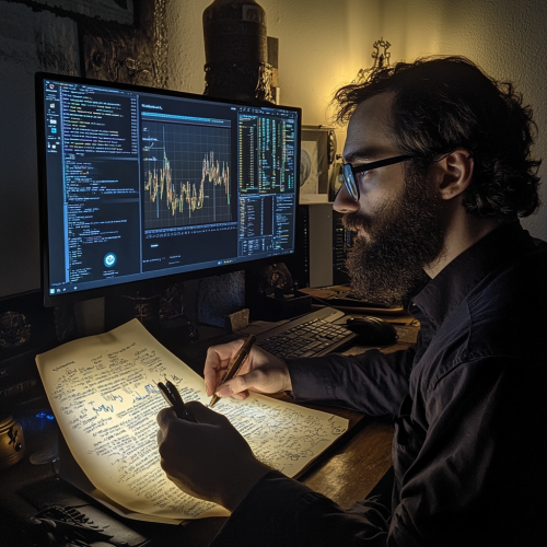 a person sitting in front of a computer display, writing on some pergament rolls with his left hand and using the mouse with his right hand. On the display, in dark theme, is a programming interface with graphs and pie-charts.
