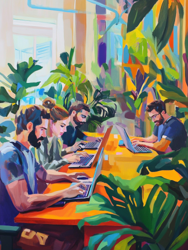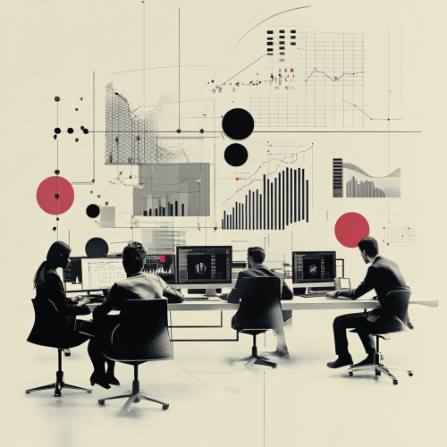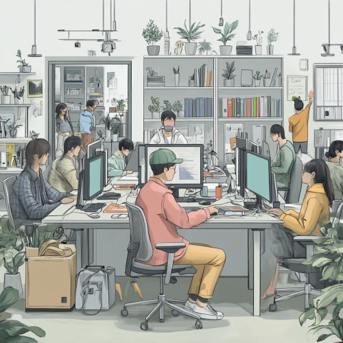 Generate a digital art for A digital art scene showing a project manager overseeing a team working on computers, with a visual representation of software implementation and a graph showing a 20% increase in productivity. Use light gray as the background color. --ar 1:1