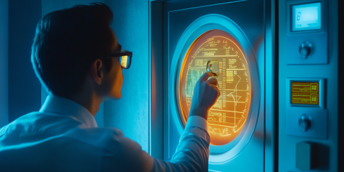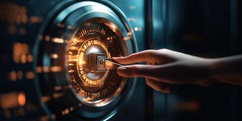 Advisor opens the safe, using a digital tool or key to unlock and access the data, charts around it, data being analyzed, progress bars, kodak photo, poster style, realistic --ar 2:1