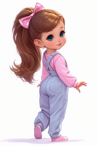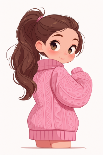 A cute girl very fashion kawaii chibi going forward, rear view, 3/4 side view face turned back smiling, full body, in the style of kawaii chibi style, high ponytail, ugly sweater couture, in the style of detailed fashion chibi cartoon, vibrantcare color pink, winter fire beautiful big face, sweet and smiling features posing and fashion show style thomas kinkade Nadja Baxter Anne Stokes nancy noel, against a white background, clear background separation, digital art in the style of Anna Dittmann, using digital art techniques such as marker illustrations, ink washes, and hand-drawn elements, adorable digital illustration, highly detailed, 2d, kawaii, flat --ar 2:3 --niji 6
