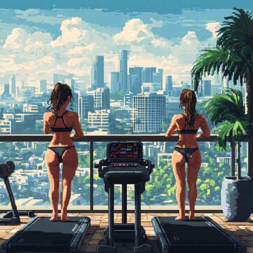 image of cute girls working out in a awesome gym inn the backround scene of the gym it's a beautiful view of a los angeles pixel art and make it 2200x460px