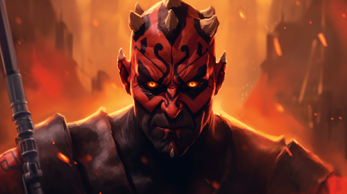 A centered, highly detailed portrait of Darth Maul from Star Wars the clone wars, his intense, red and black tattooed face illuminated by a fierce, fiery glow. He is glaring directly into the camera with a deathly stare, his red Sith eyes glowing with rage. His signature horns are fully visible, and his expression is one of pure fury and dark power. In the background, a chaotic inferno blazes, casting dramatic shadows across his menacing face, enhancing his intimidating presence. The fiery atmosphere reflects his inner rage and power, capturing his dark, Sith nature with intricate detail and intensity. --v 5.1 --s 1000 --ar 16:9