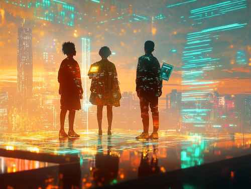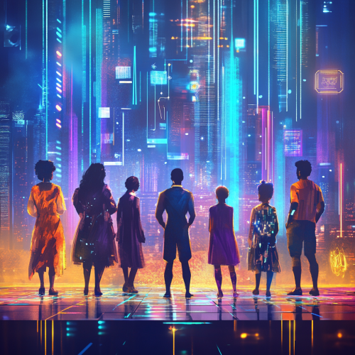 Realistic, shot on Fujifilm, A vibrant and inspirational digital illustration of African digital innovators standing on a stage, bathed in light, symbolizing recognition and celebration. The scene is dynamic, with a futuristic city skyline in the background and digital elements such as holograms and floating data symbols. The figures should reflect diversity in age, gender, and attire, representing a variety of digital and creative roles. The mood is empowering and triumphant, with colors that evoke energy and excitement --ar 4:3 --v 6.1