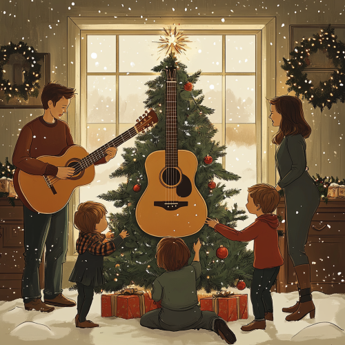 illustration of a Christmas with three children at the base of the Christmas tree and their parents together in the background. There is a guitar on the Christmas tree.digital art style