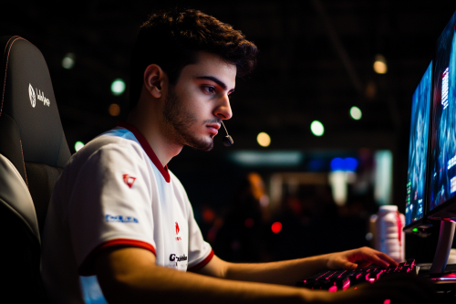 A man sitting at his desk, wearing a white T-shirt with short sleeves, playing computer games in the dark room, focused on typing, side view, photography style, and natural light. The office is decorated with modern furniture and minimalist decorative elements, creating an atmosphere of calmness and focus. realities --v 6.1 --ar 128:85