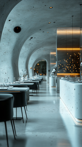A sleek, ultra-modern restaurant interior with a minimalist, futuristic design. White walls, smooth concrete floors, and sculpted black furniture create a streamlined look. Touchscreen menus are integrated into each table, with soft blue LED lighting outlining the furniture, casting a calm glow. The open kitchen is visible through a glass wall, where robotic arms assist chefs in a high-tech culinary display. Ultra-realistic, ultra-high definition. --ar 9:16 --style raw --v 6.1 --s 750