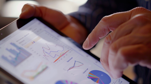 Advisor using a digital tool or key to unlock and access the data, open the safe, charts around it, data being analyzed, progress bars, kodak photo, poster. style, --ar 2:1