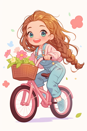 A cute girl very fashion kawaii chibi riding a bicycle and smiling brightly, with flowers on the basket, looking straight ahead, full body, in the style of kawaii chibi style, Waterfall braid hair, dynamic, ,lightblue suit overalls jacket shoes all in color waterpink, beautiful big face, sweet and smiling features posing and fashion show style thomas kinkade Nadja Baxter Anne Stokes nancy noel, against a white background, clear background separation, digital art in the style of Anna Dittmann, using digital art techniques such as marker illustrations, ink washes, and hand-drawn elements, adorable digital illustration, highly detailed, 2d, kawaii, flat --ar 2:3 --niji 6