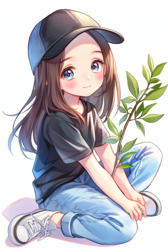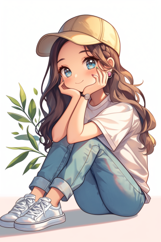 A cute girl very fashion kawaii chibi sitting on the ground in a comfortable position, one hand supporting chin, one hand holding a branch and looking at the branch, smiling face shows effort and never giving up, full body, in the style of kawaii chibi style, wear a cap, blue jeans t-shirt shoes all in color silver, beautiful big face, sweet and smiling features posing and fashion show style thomas kinkade Nadja Baxter Anne Stokes nancy noel, against a white background, clear background separation, digital art in the style of Anna Dittmann, using digital art techniques such as marker illustrations, ink washes, and hand-drawn elements, adorable digital illustration, highly detailed, 2d, kawaii, flat --ar 2:3 --niji 6
