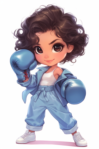 A cute girl very fashion kawaii chibi wear boxing gloves, full body, in the style of kawaii chibi style, Short bob with curls hair, dynamic, powerful facial expression, pastel blue suit overalls jacket shoes all in color silver beautiful big face, sweet and smiling features posing and fashion show style thomas kinkade Nadja Baxter Anne Stokes nancy noel, against a white background, clear background separation, digital art in the style of Anna Dittmann, using digital art techniques such as marker illustrations, ink washes, and hand-drawn elements, adorable digital illustration, highly detailed, 2d, kawaii, flat --ar 2:3 --niji 6