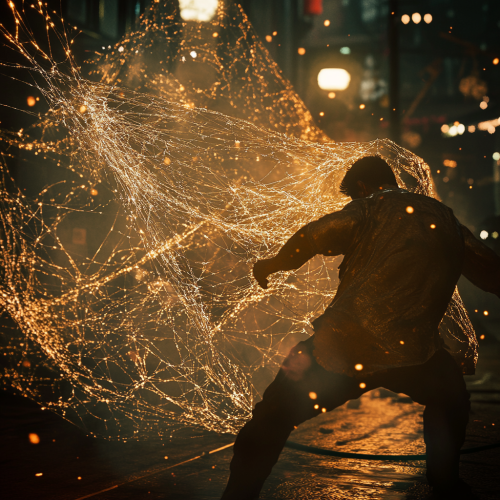 a dramatic shot of a man using webs of fate to predict the outcome of an opponents move in a fight. He predicts where his opponent is going to be and swings for that spot. Dynamic lighting. Cinematic quality. Highly detailed.