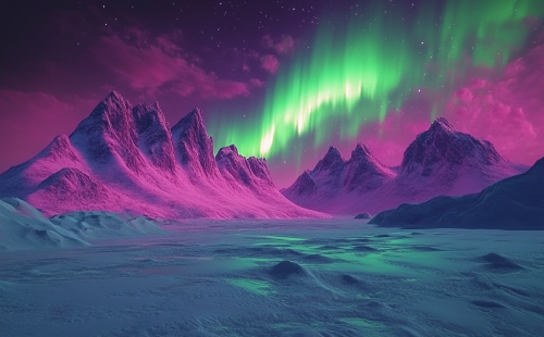 Digital artwork of an icy winter landscape with towering, stylized mountains in the background, illuminated by vibrant Northern Lights in rich greens and purples – in the foreground, a smooth, expansive snowfield, softly glowing under a mystical sky, high detail, vibrant colors, soft lighting, surreal and atmospheric, 4K resolution --ar 45:28 --v 6.1