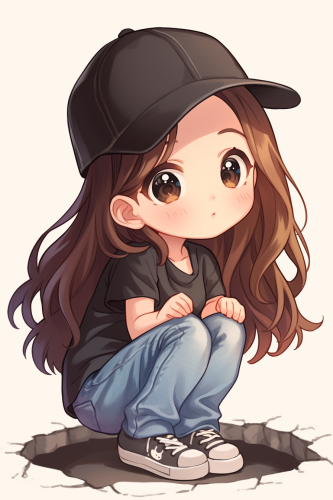 A cute girl very fashion kawaii chibi sitting on the ground in a comfortable position, sitting on the ground with knees bent, in a comfortable position, holding a branch in hand and looking at the branch, smiling face shows effort and never giving up, full body, in the style of kawaii chibi style, wear a cap, blue jeans t-shirt shoes all in color silver, beautiful big face, sweet and smiling features posing and fashion show style thomas kinkade Nadja Baxter Anne Stokes nancy noel, against a white background, clear background separation, digital art in the style of Anna Dittmann, using digital art techniques such as marker illustrations, ink washes, and hand-drawn elements, adorable digital illustration, highly detailed, 2d, kawaii, flat --ar 2:3 --niji 6
