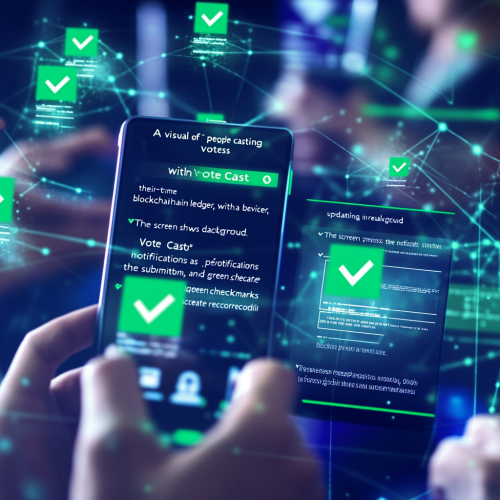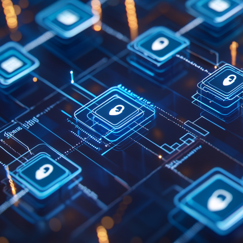 An open, transparent blockchain ledger visual on a digital display, showing transactions securely recorded with checkmarks. The design has layers to symbolize security measures, with locks and verification icons, all in a sleek blue and silver color scheme