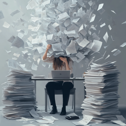 Generate a digital art for A digital art scene depicting a person overwhelmed with work, surrounded by stacks of papers and a computer screen filled with tasks, symbolizing excessive workload. The background should be in light gray color. --ar 1:1