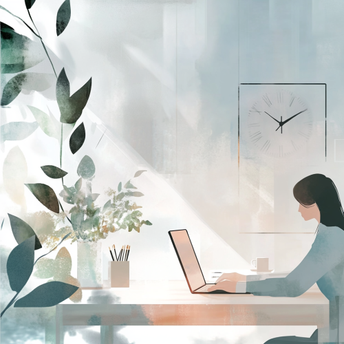 Generate a digital art for A digital art scene showing a person working remotely at a desk with a serene background. The person is surrounded by soft, calming colors like light gray and white, symbolizing the importance of setting boundaries and taking breaks. The background includes subtle elements like a clock and a plant to represent time management and a balanced environment. --ar 1:1