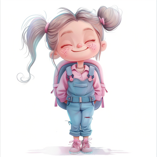 A cute girl very fashion kawaii chibi with backpack on her back, eyes closed and smiling brightly, face upturned to the sky, full body, in the style of kawaii chibi style, High bun, lightblue suit overalls jacket shoes all in color waterpink, beautiful big face, sweet and smiling features posing and fashion show style thomas kinkade Nadja Baxter Anne Stokes nancy noel, against a white background, clear background separation, digital art in the style of Anna --v 6.0
