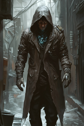 a full body shot of a sneaky male grimdark street thief. He wears a dirty trenchcoat with tech gizmos. In the background is a grimdark alley with tech trash. digital painting --ar 2:3 --v 6.1
