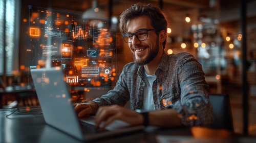 A confident business owner smiling while working on a sleek laptop at a modern desk in a minimalist, bright office. Floating around the desk are vibrant holographic elements, glowing brightly, representing the '3 secrets'--digital marketing icons like social media ads, email campaigns, and e-commerce platforms. These holograms are the focal point, radiating energy and success, with clear, upward-trending sales graphs visible on the laptop screen. The room is bathed in warm sunlight streaming through large windows, creating a dynamic contrast between the real-world setting and the futuristic holograms. Hyper-realistic style, ultra-detailed textures, 4K resolution, clean, motivational, and high-tech atmosphere. --ar 16:9 --s 750