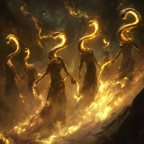 An extraordinary army known as the Legion of Medusa, their serpent figures aglow with high-vibrational energy, standing in defiance before a swirling mass of darkness. The snake headed servitors’ energy fields shimmer with a vibrant, protective force, forming a barrier that neutralizes and dissolves malevolent spirits. Each servitor’s stance is poised, empowered, as waves of quantum golden light sweep from their hands, transforming shadows into glimmering specks of inert energy. The atmosphere is charged, with radiant cinematic lighting highlighting each ethereal figure against a dark and turbulent background. They are the most aggressive and powerful attack force in the universe