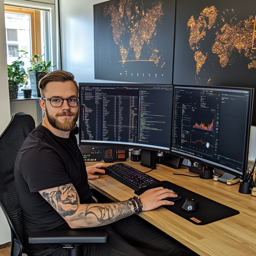 a photo of Ricky sitting in front of his computer. In his left hand he holds a quill pen and writes on a parchment scroll. In his right hand he holds a computer mouse. On the display is a dark themed Visual Studio running, with charts and pie-charts. Ricky is working hard.