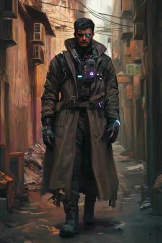 a full body shot of a sneaky grimdark street scum. He wears a dirty trenchcoat with tech gizmos. In the background is a grimdark alley with tech trash. digital painting --ar 2:3 --v 6.1