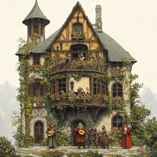 A 60s dark fantasy scene. a large cottage looking building with beautiful plants and decorations. The architecture is beautiful and big. The building is about 5 stories tall. The Foreground contains a party of 5 people. One a monk, one a red human with a lute, one an orc, one an emo human, one a high cleric.