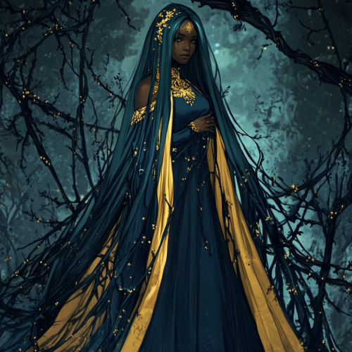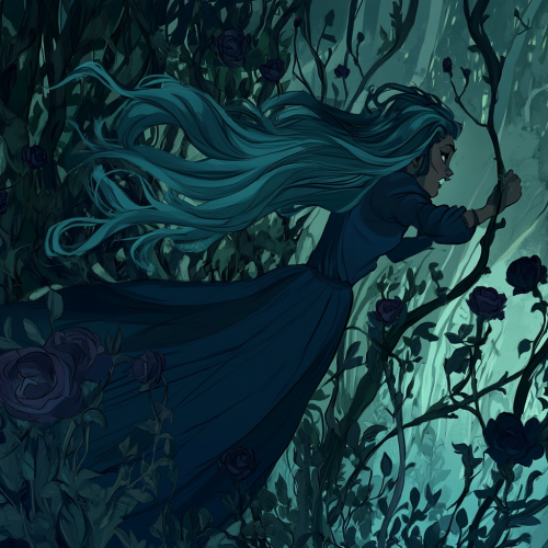 webtoon style black princess with very long teal hair, in navy blue gown running away from large thorny bramble with dark purple flowers, very large wooden vines with thorns