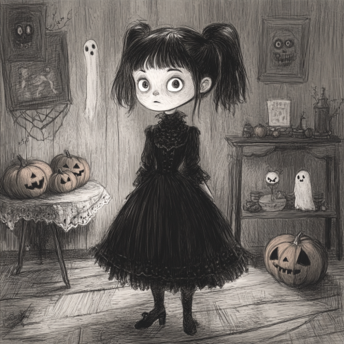 Illustrate a whimsical yet eerie character of a clown with a mushroom-like hat, blending Edward Gorey's style with a fantastical forest theme. The clown should have a simple, expressive design with a subtle smile, evoking both charm and unease. Use intricate cross-hatching to give texture to the clown’s face, hat, and outfit, emphasizing the organic, fungal elements. The hat and clothing should resemble delicate, detailed mushrooms, with tendrils and spore-like shapes growing around. The background should be minimalistic, with only faint suggestions of a forest floor or twisted roots, enhancing the character's surreal isolation. Include symbolic details, like small mushrooms or gnarled branches, to create a haunting, fairy-tale atmosphere.