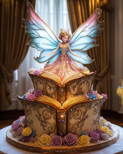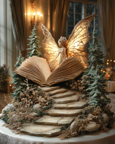 Create an extremely tall and gigantic beautiful cake design that features a very large and wide open story book. Large Magical Rococo Victorian fairy with very tall and large wings. A stone pathway and very tall trees. This cake design sits on a large dessert table with curtains in the background with spotlights on the cake. The cake is displayed in the corner of a grand ballroom. --ar 4:5 --v 6.1 --stylize 300
