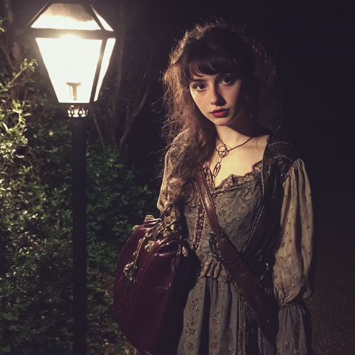 A girl with dark brown hair, dressed in a vintage fairy theme, a burgundy bag on her arm, amateurishly shot from an iPhone camera, under a street lamp