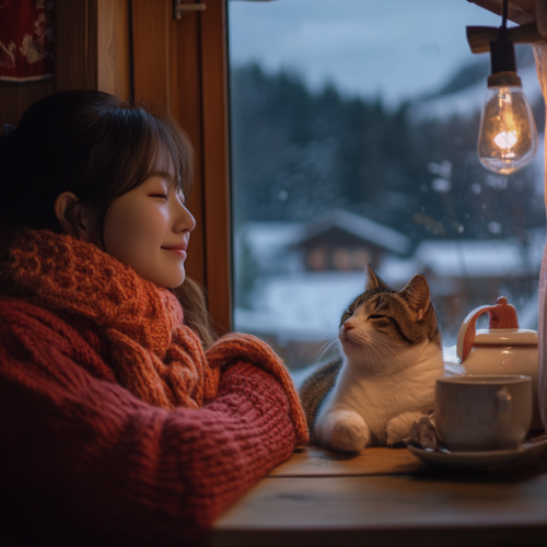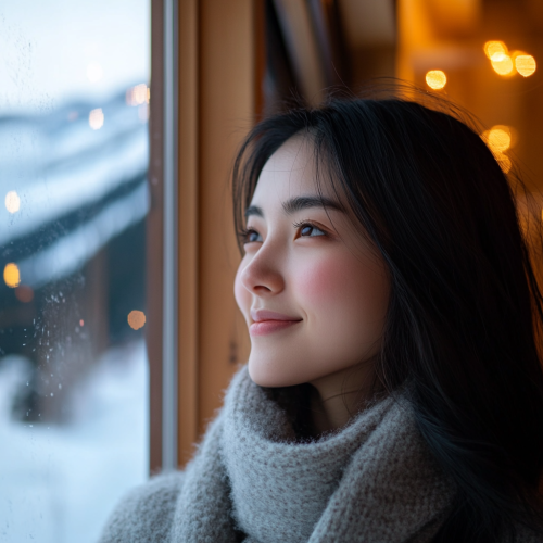Close-Up shot, side view, looking at side hyper realistic, winter, dusk, snowy, korean Solo, Vancouver, Canada, warm Christmas atmosphere inside a cabin, cocoa, brightly smiling Korean woman, mountain view, snowy landscape, fairytale atmosphere, Canon EOS R5 with a 200mm lens, --style raw --v 6.1 --ar 1:1